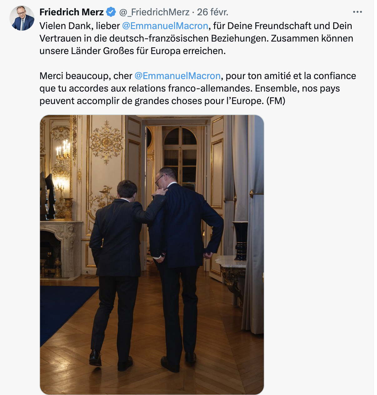 Friedrich Merz semble avoir établi une relation plus chaleureuse avec Emmanuel Macron et partage avec le président français des idées communes sur l’avenir de l’Europe et la relation transatlantique. Le futur chancelier qui incarne la CDU rhénane d’un Helmut Kohl est francophile et une photo de de Gaulle et Adenauer à la cathédrale de Reims orne son bureau au siège de la CDU.