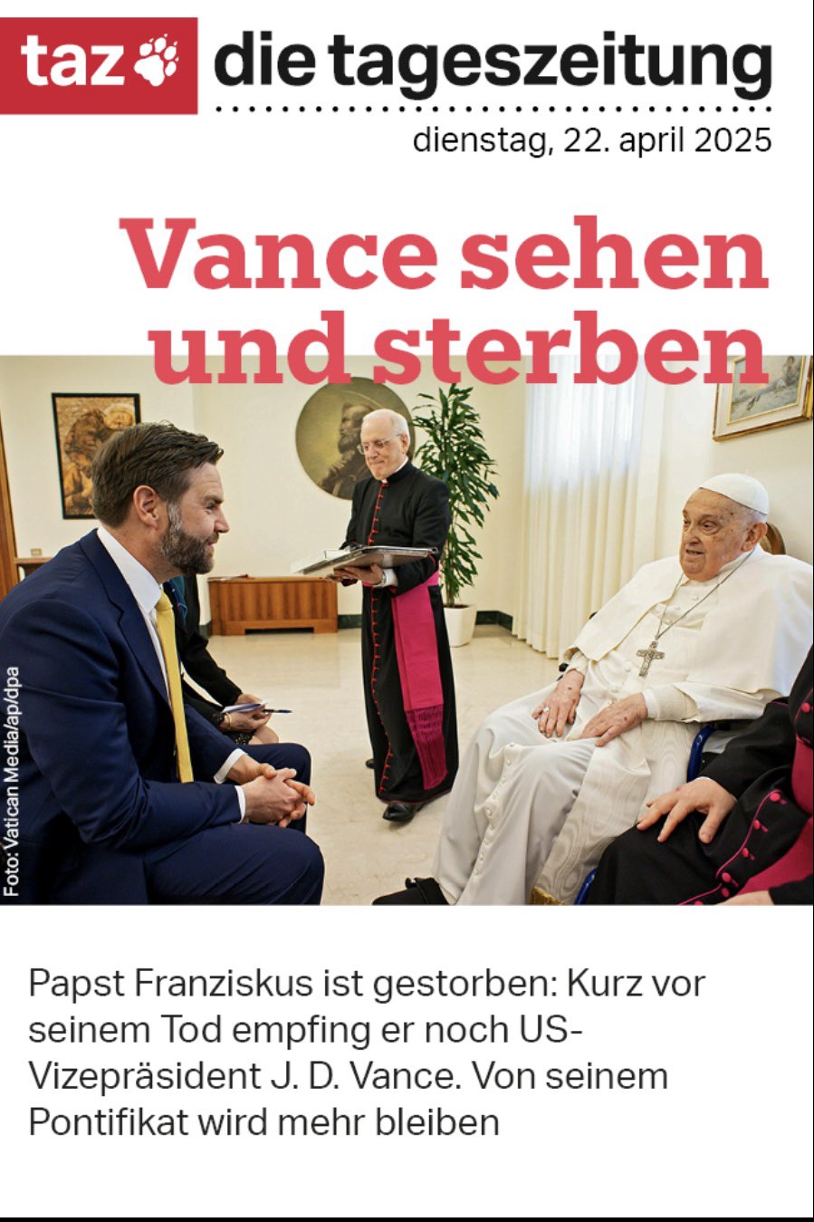 ”Voir Vance et mourir” : le quotidien de gauche, habitué des unes percutantes, évoquait mardi le dernier hôte officiel du pape avant la mort du souverain pontife.
