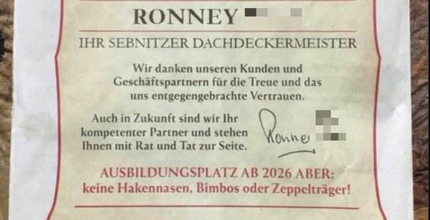 Comment une telle petite annonce peut-elle être diffusée dans le magazine édité par une ville ? Le texte publié par un couvreur de Sebnitz en Saxe qui vantait les mérites de sa petite entreprise ajoutait qu’il comptait offrir une place d’apprenti à partir de l’an prochain avant de préciser : “Pas de nez crochus, pas de métèques”. A l’heure où l’extrême-droite atteint des records dans la partie Est du pays où la parole se libère de plus en plus, cette publication a choqué. La municipalité a condamné la publication précisant qu’une agence se chargeait d’acquérir les publicités. On a déjà vu mieux côté relecture… Le conseil municipal de Sebnitz a condamné la petite annonce raciste, une déclaration soutenue par les élus du parti d’extrême-droite AfD.
