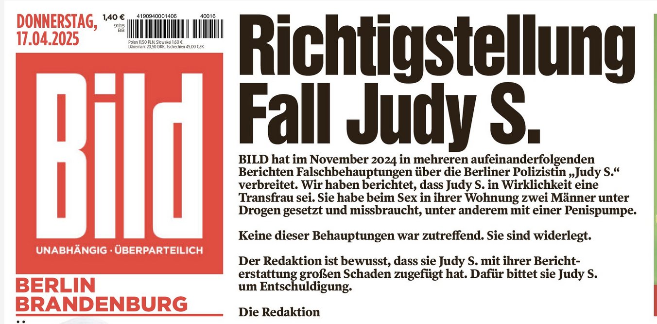 C’est du jamais vu. Le quotidien à sensation “Bild” a présenté la semaine dernière en une ses plus plates excuses après des publications l’an dernier sur une policière berlinoise, Judy S., complètement inventées. Le journal avait présenté la fonctionnaire comme une personne trans qui aurait administré des drogues à des hommes avant de les maltraiter sexuellement. Un accord a été trouvé devant la justice. La victime dont la carrière a d’abord été remise en cause aurait obtenu 150 000 Euros du journal.