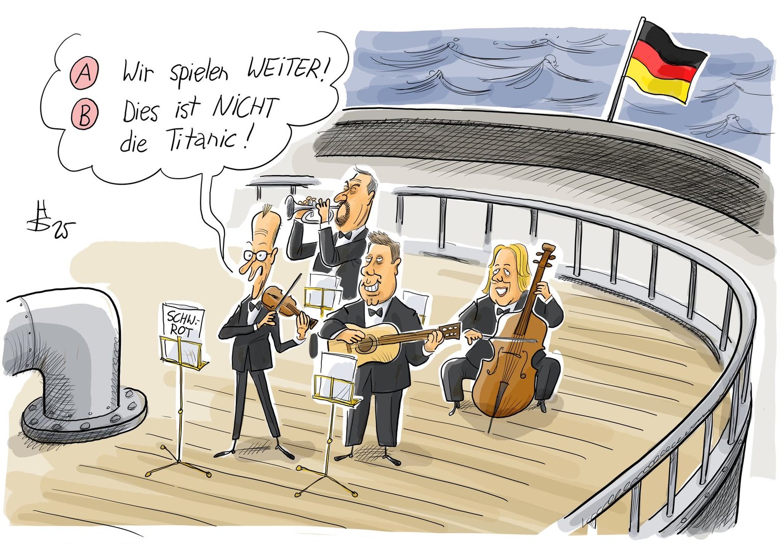 Le premier violon Merz : “A-nous continuons à jouer; B-ça n’est pas le Titanic !”
