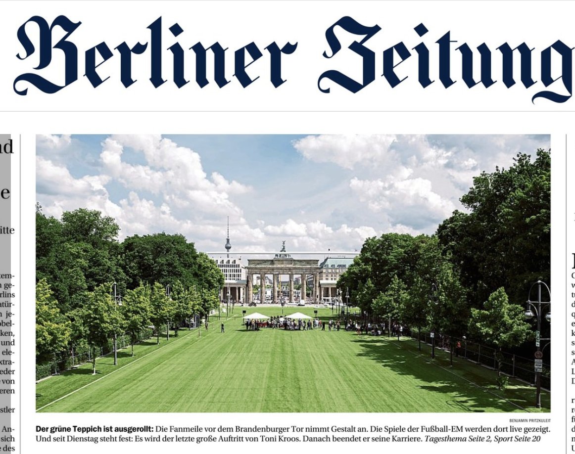 L’Allemagne héberge la compétition de football cette année. Comme lors des grandes manifestations sportives, le grand axe Est-Ouest au coeur du parc de Tiergarten à Berlin se transforme pour l’occasion en fan zone. La rue du 17 juin (1953 : soulèvement ouvrier en RDA) ressemble pour quelques semaines à un gigantesque terrain de foot avec de la pelouse synthétique. L’esplanade devant le Reichstag sera également utilisée.