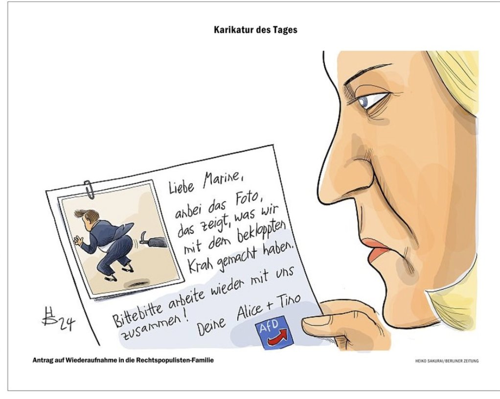 L’AfD exclue du groupe d’extrême-droite au parlement européen. Pour certains dont le RN, le parti allemand sent trop le soufre et remet en cause la stratégie de dédiabolisation. La petite carte des co-présidents de l’AfD restera sans doute sans réponse : “Chère Marine, ci-joint la photo montrant ce que nous avons fait avec cet abruti de Krah (la tête de liste AfD aux Européennes pour qui tous les SS n’étaient pas des criminels). S’il te plait, s’il te plait, continue à travailler avec nous !”