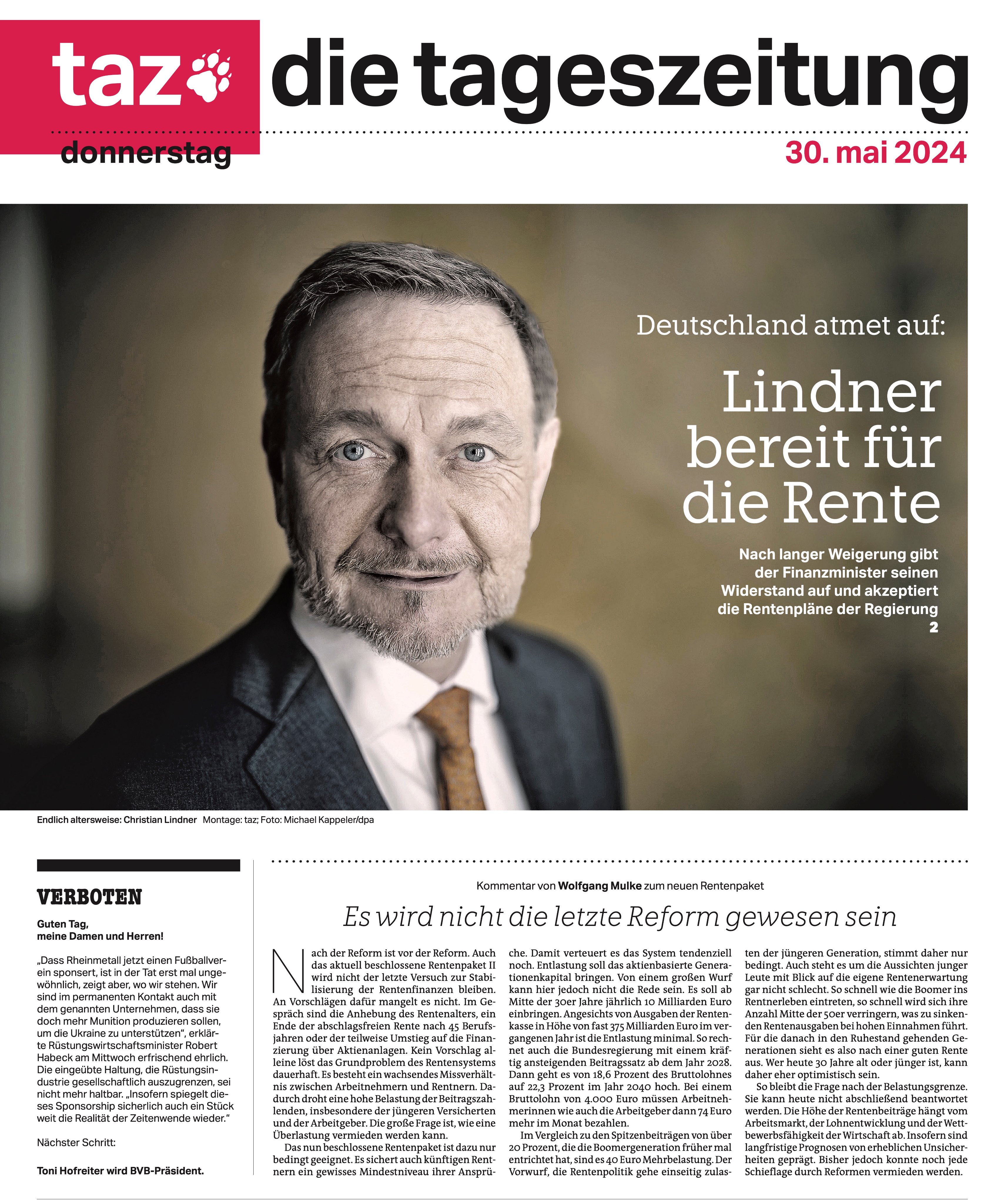 ”Lindner prêt pour la retraite” le quotidien ironise sur le ministre libéral des Finances (vieilli sur la photo) qui a fini par accepté le plan voulu d’abord par le SPD.