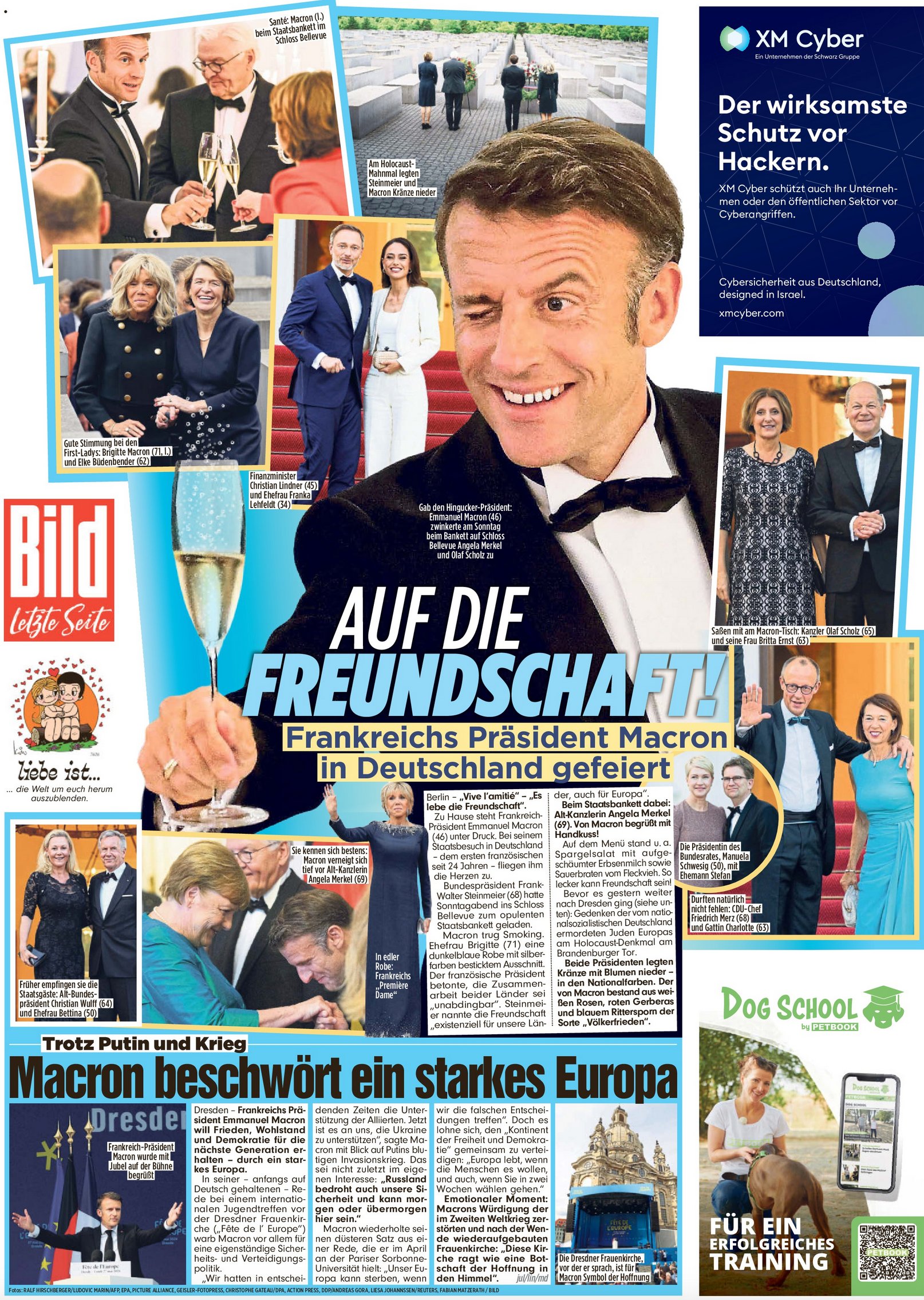La dernière page du quotidien “Bild Zeitung” “A l’amitié, le président Macron fêté en Allemagne”