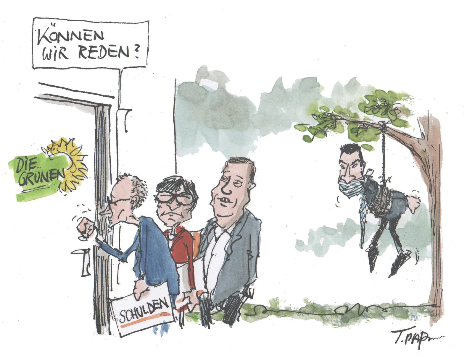 Merz et les deux co-présidents du SPD frappent à la porte des Verts pour obtenir leur soutien. Markus Söder, le chef de la CSU bavaroise, qui a attaqué sans vergogne les écologistes durant la campagne est présenté ici comme le troubadour Assurancetourix baillonné. Il ne négocie pas avec les verts.