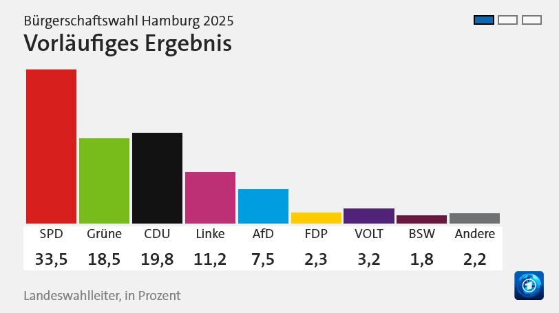 Le scrutin dans la ville Etat du Nord de l’Allemagne -un des seize Länder allemands- a redonné un peu de baume au coeur endolori des sociaux-démocrates. Malgré des pertes, le SPD arrive en tête dans son fief (dont un certain Olaf Scholz a été le maire) et devrait reconduire sa coalition avec les écologistes même si sur le papier une alliance avec les chrétiens-démocrates serait envisageable.
