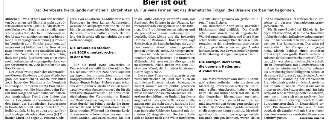 -la consommation de bière en recul de 4,5% l’an passé. Certes, la bagatelle de 8,4 milliards de litres ont été bus -Prosit! Mais la tendance sur la durée est négative après un rattrapage post-Covid. Le président de la fédération allemande parle déjà d’un “Brauereisterben” pour évoquer la disparition des brasseries.