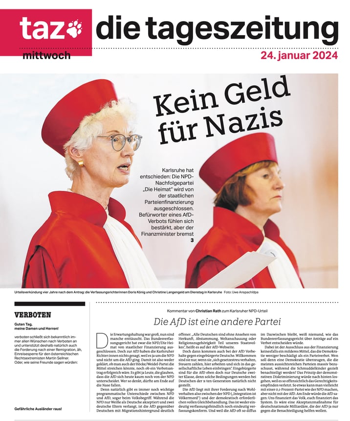 Les débats se poursuivent sur une possible interdiction de l’AfD. Mais les critères sont très difficiles à remplir et un échec devant la cour constitutionnelle compétente en la matière constituerait une formidable victoire pour le parti d’extrême-droite. Le tribunal avait ainsi rejeté une telle demande contre le parti néo-nazi NPD. Pour Karlsruhe, le mouvement avait clairement un programme contraire à la démocratie mais son poids politique minime n’en faisait pas pour autant un danger pour l’Allemagne. Dans la foulée de ce jugement, une loi a prévu la possibilité de supprimer les financements publics à des partis sapant les principes démocratiques. La semaine dernière, la cour constitutionnelle a avalisé une telle mesure contre le mouvement NPD rebaptisé depuis “Heimat” (patrie). “Pas d’argent pour les Nazis” pouvait on lire le lendemain à la une du quotidien de gauche “Tageszeitung”.