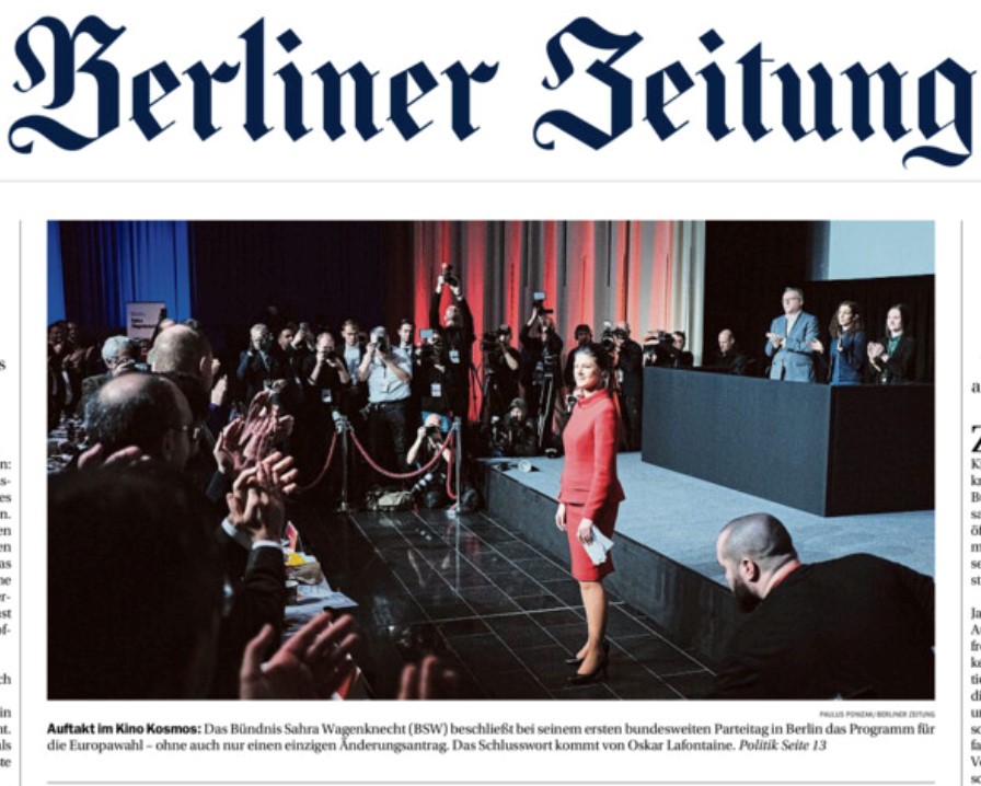 La une du quotidien berlinois ci-dessous le montre bien : le mouvement lancé début janvier (en allemand BSW) qui porte le nom de son égérie n’est pas exempt d’un certain culte de la personnalité. Sahra Wagenknecht, figure centrale du parti Die Linke, donnait de l’urticaire à ses camarades avec ses positions restrictives sur l’immigration ou son rejet de thèses post-modernes comme la politique du genre.