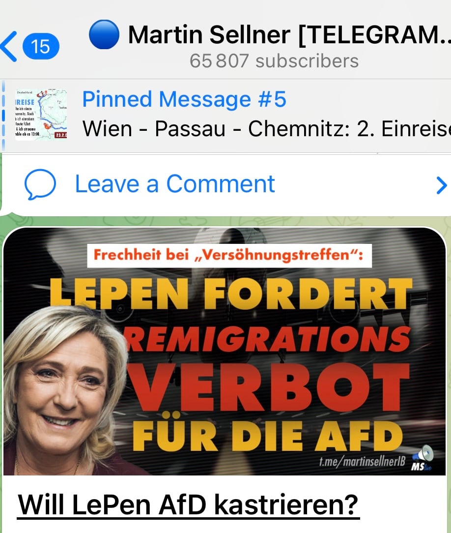 “Le Pen veut-elle castrer l’AfD ?” : la publication du poster boy du mouvement identitaire germanique, l’Autrichien Martin Sellner, sur Telegram résume les tensions actuelles entre des les partis d’extrême-droite. Le RN qui cherche depuis des années à se donner une façade plus respectacle n’a pas goûté les révélations dans la presse allemande (en fait un objectif bien connu) sur la volonté de l’AfD d’expulser massivement des étrangers mais aussi des Allemands d’origine étrangère.