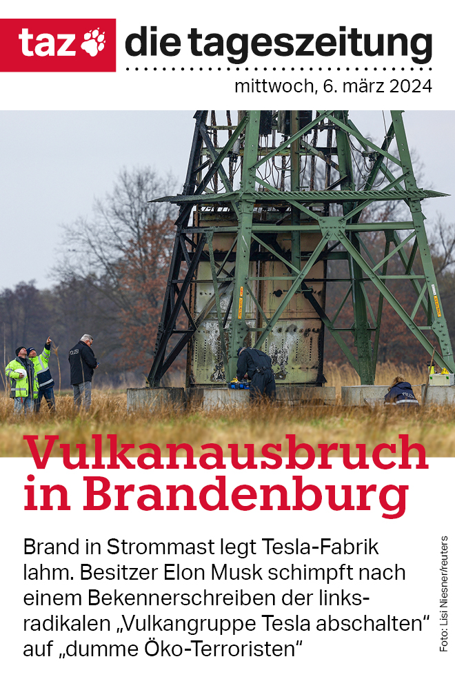 “Eruption volcanique dans le Brandebourg" peut-on lire ci-dessous à la une du quotidien “Tageszeitung” connu pour ses titres ironiques. La région n’est pas en effet connue pour ce risque naturel. Le titre du journal fait référence au groupe d’extrême-gauche “Vulkan” (en français “volcan”) qui a revendiqué un attentat contre un pylone alimentant la Gigafactory de Tesla dans les environs de Berlin.