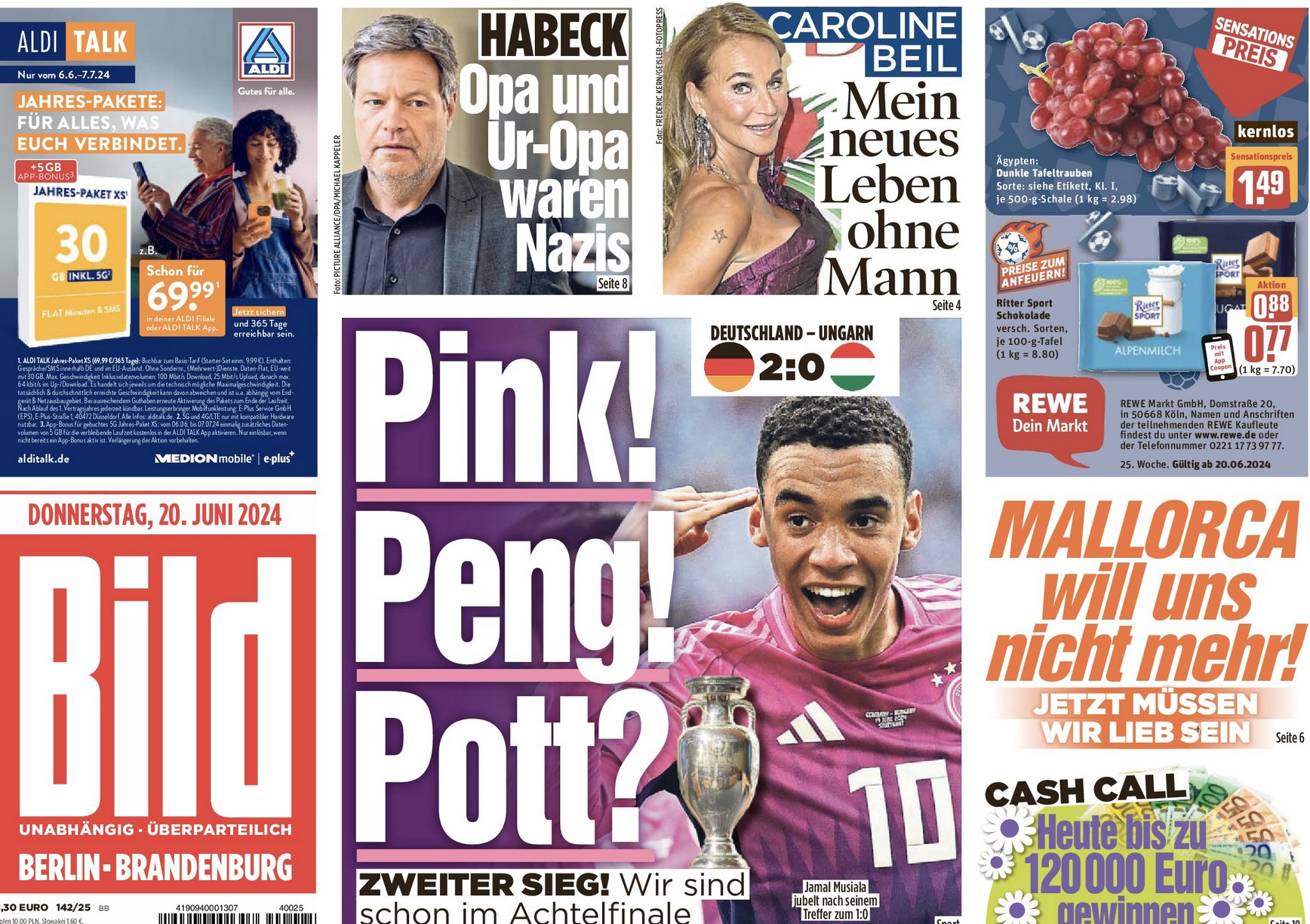 L’Allemagne a fini première de son groupe dimanche soir. Lentement mais sûrement, les Allemands s’enthousiasment pour leur équipe. Le quotidien “Bild Zeitung” qui ne fait jamais dans la dentelle est déjà aux anges et titrait jeudi dernier “Pink ! (la couleur des maillots de la Mannschaft) But ! Coupe?”