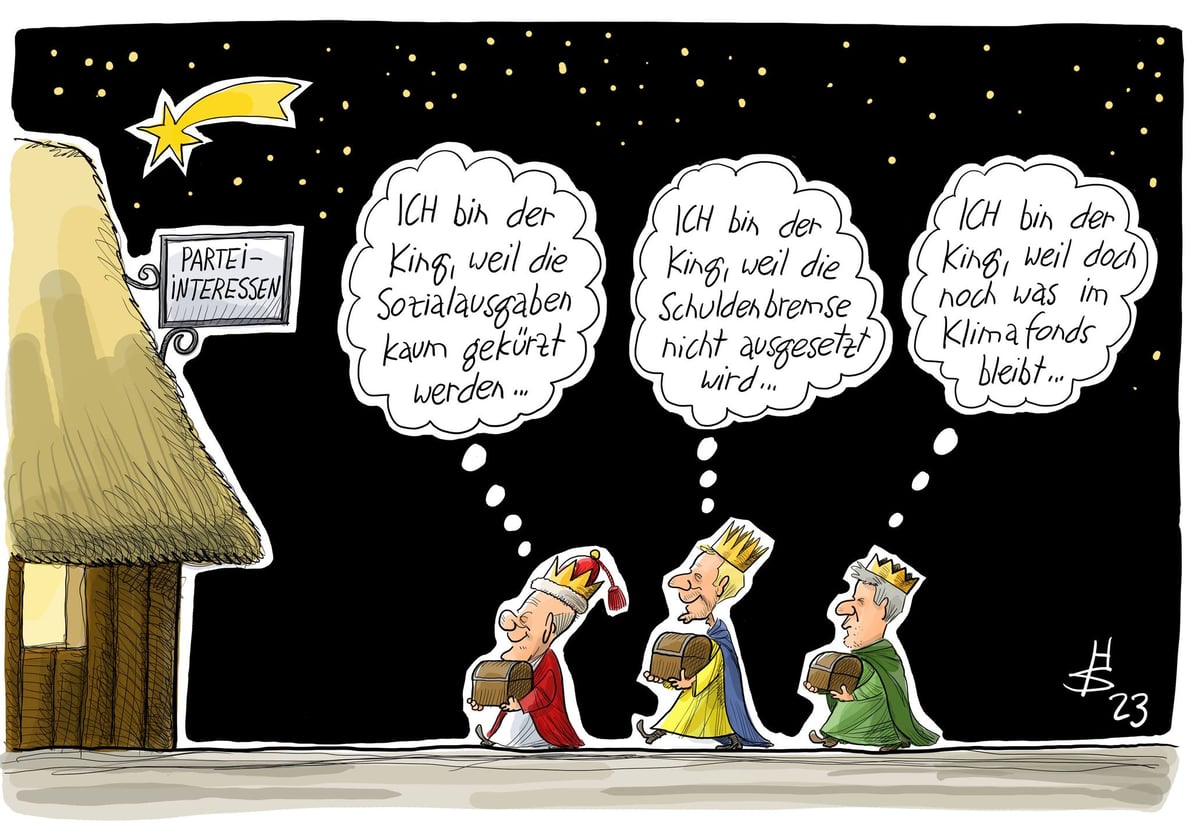 Bref, il restait donc aux trois partis au pouvoir à faire des économies (17 milliards) pour respecter le frein à l’endettement en 2024. Après 200 heures de négociations entre Olaf Scholz, le vice-chancelier Robert Habeck (vert) et le ministre des Finances libéral Christian Lindner, un compromis a été trouvé et présenté mercredi. Comme dans toute négociation, chacun a dû faire des concessions. La caricature ci-dessus montre les rois mages Olaf, Christian et Robert avec leurs offrandes qu’ils apportent à l’auberge des intérêts partisans. Scholz : “Je suis le roi car je n’ai pas réduit les dépenses sociales”; Lindner “Je suis le roi car le frein à la dette n’est pas suspendu”; Habeck : “Je suis le roi car le fonds pour le climat dispose encore de ressources”.