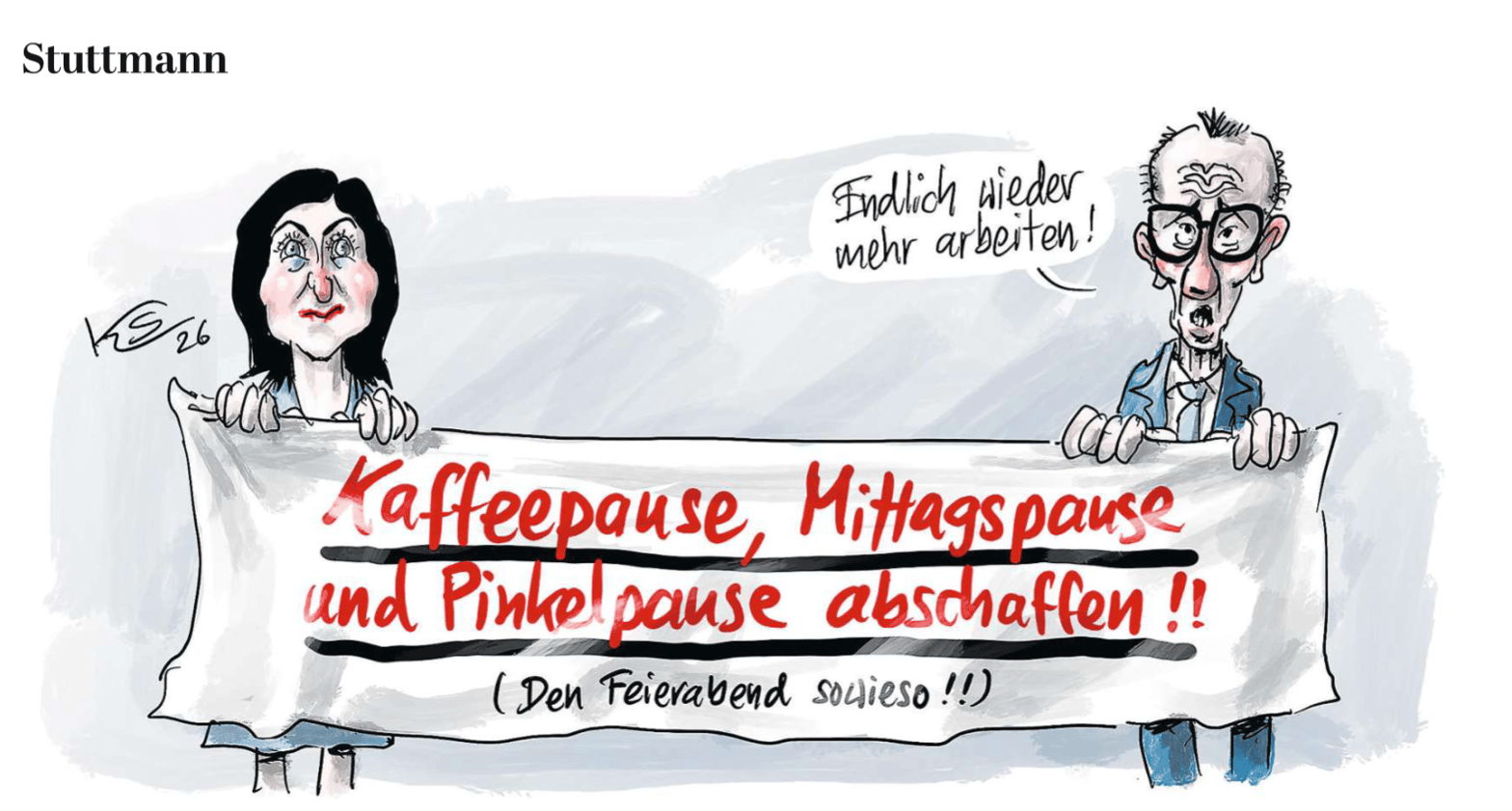Sur la banderolle de la ministre de l’Economie Katherina Reiche et de Friedrich Merz, on peut lire : “Supprimer les pauses café, les pauses déjeuner et les pauses pipi”. Le chancelier ajoute : “Enfin travailler !”