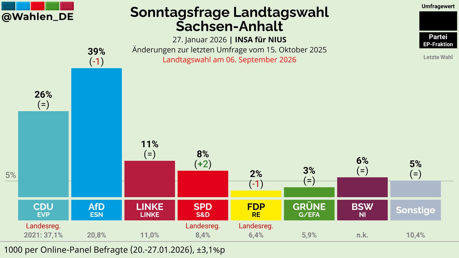 On vote en septembre dans cette autre région de l’Est du pays où l’AfD est aux portes du pouvoir (sondage ci-dessous). Le parti d’extrême-droite est crédité de 39%. L’arithmétique électorale place l’AfD dans cette région à un doigt de la majorité en sièges ce qui constituerait un tremblement de terre dans un pays encore marqué par l’héritage du régime nazi.