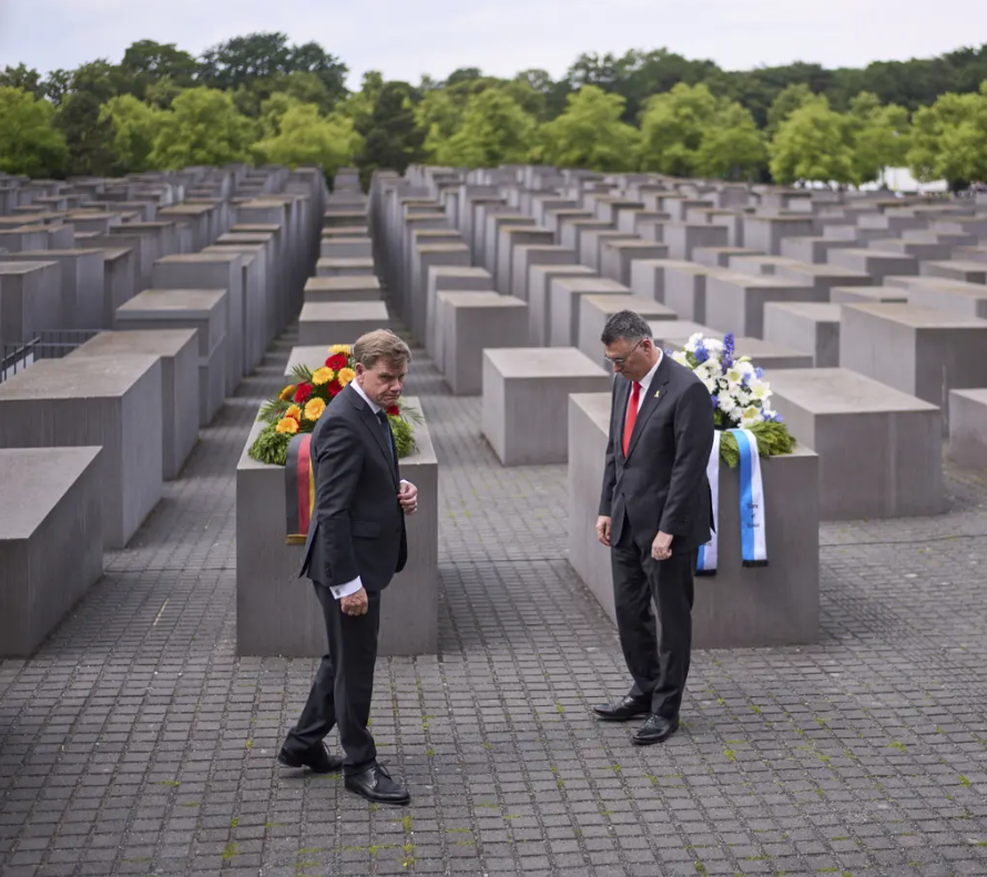 Les ministres allemand et israélien des Affaires étrangères, Johannes Wadephul et Gideon Saar, la semaine dernière au mémorial de l’holocauste à Berlin