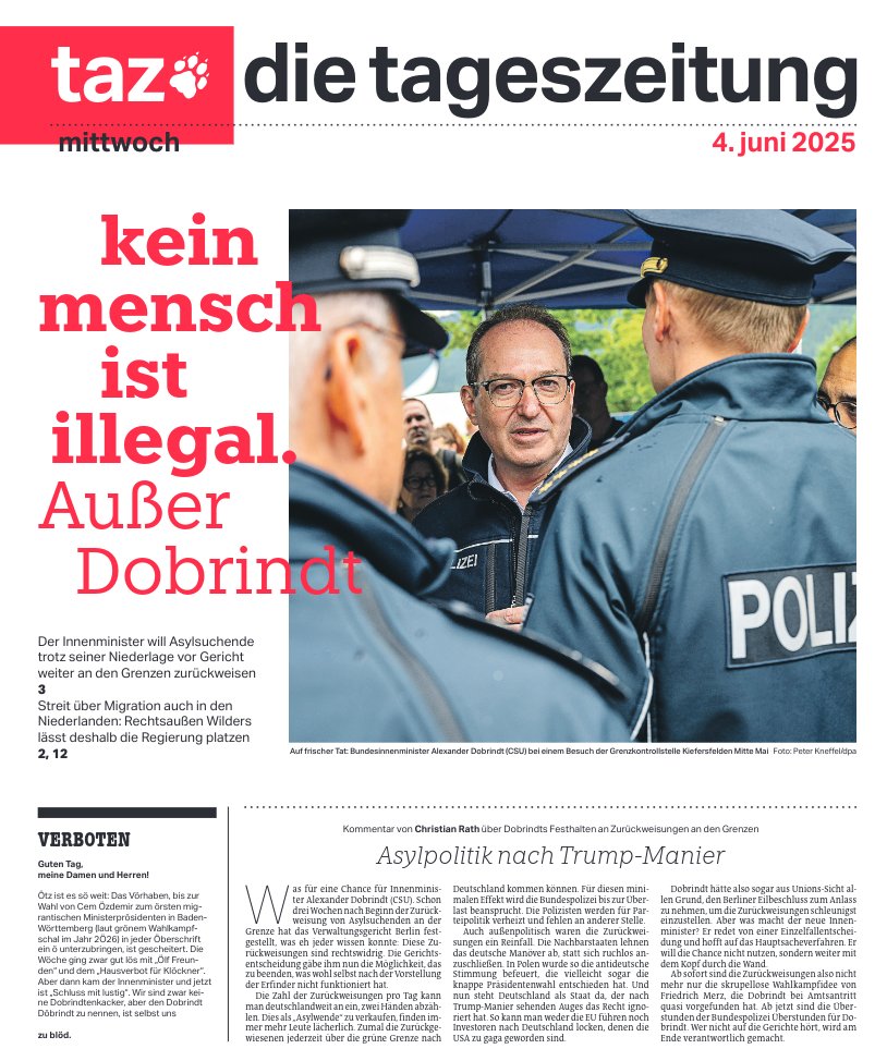 ”Personne n’est illégal, sauf Dobrindt” ironisait le quotidien la semaine dernière après la décision d’un tribunal berlinois retoquant le renvoi à la frontière de trois Somaliens qui demandaient l’asile en Allemagne.