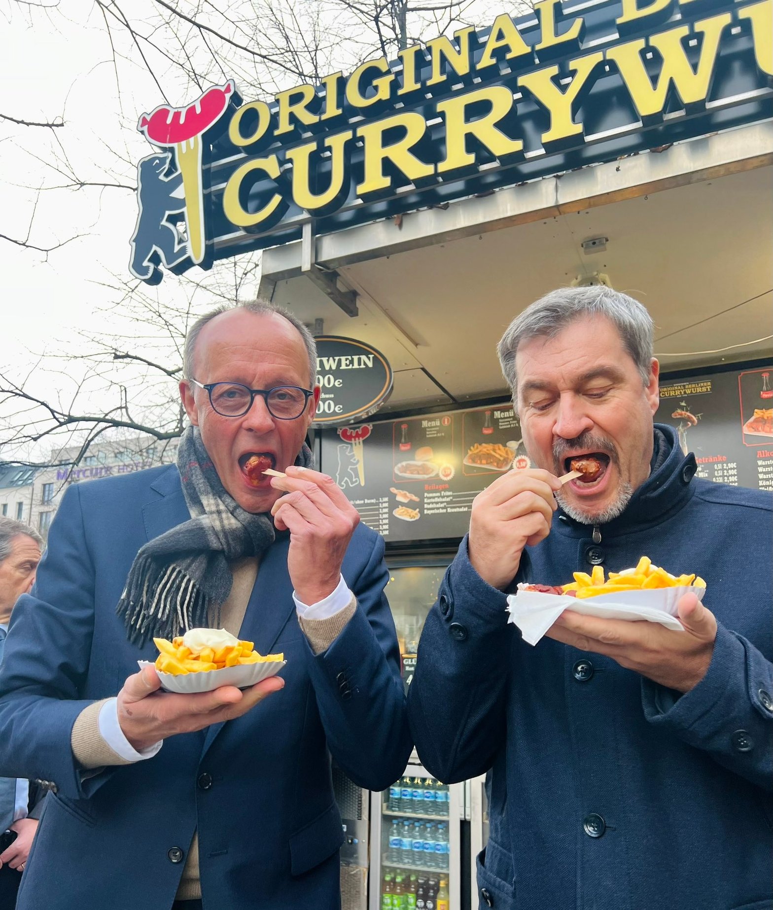 Les responsables chrétiens-démocrates, Friedrich Merz (CDU) et Markus Söder (CSU), réunis autour d’une valeur sûre, la bonne vieille saucisse au curry (à Berlin)