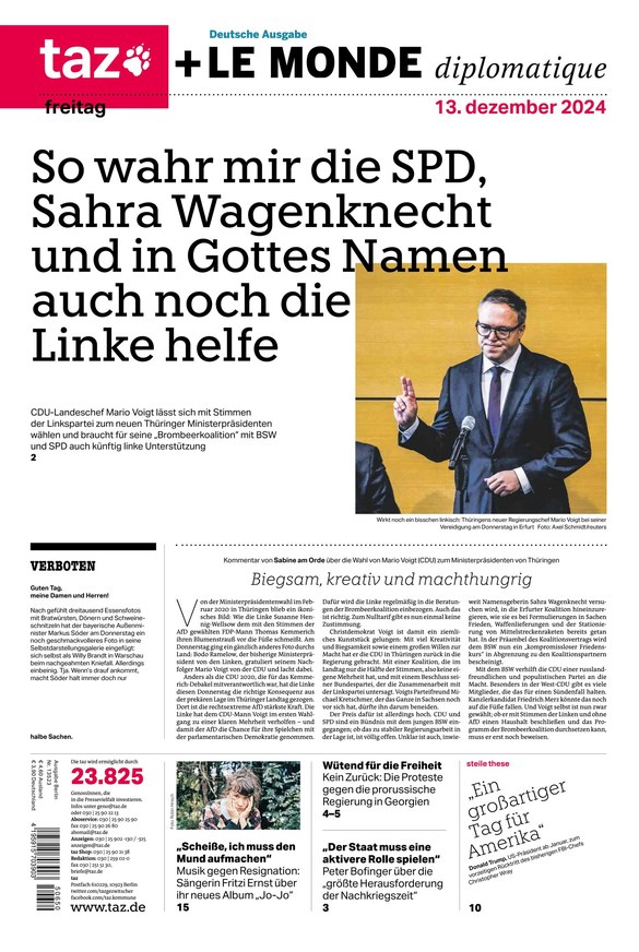 Cela vaut surtout pour la Thuringe où le chrétien-démocrate Mario Voigt (photo ci-dessus) a été élu hier. On le voit prêter serment avec un titre ironique : “avec l’aide du SPD, de Sahra Wagenknecht et du parti Die Linke”. Une coalition inédite en Allemagne s’est mise en place dans cette région connue pour ses innovations politiques : la nouvelle alliance associe la CDU qui revient au pouvoir après dix ans dans l’opposition au SPD et au BSW. Cette nouvelle force, l’alliance Sahra Wagenknecht (le nom de sa fondatrice et égérie) a été créée au début de l’année par l’ancienne responsable de la plateforme communiste au sein de Die Linke, le mouvement héritier du parti communiste est-allemand. BSW défend une politique économique et sociale de gauche, plaide pour une politique dure sur l’immigration et rejette les aides à l’Ukraine. Cette alliance avec la CDU, un parti traditionnellement anti-communiste et atlantiste et qui affiche sa solidarité avec l’Ukraine surprend. Il manque un siège à la nouvelle coalition baptisée “mûre” (le fruit) au parlement régional de Thuringe. Des rencontres régulières et un pacte de non agression permettront au nouveau gouvernement d’être toléré par Die Linke. Ironie de l’histoire : un congrès de la CDU avait il y a quelques années exclu toute alliance des chrétiens-démocrates avec ce parti -et avec l’extrême-droite. Difficile à suivre pour l’électeur moyen et une pilule amère pour d’aucuns à la CDU.