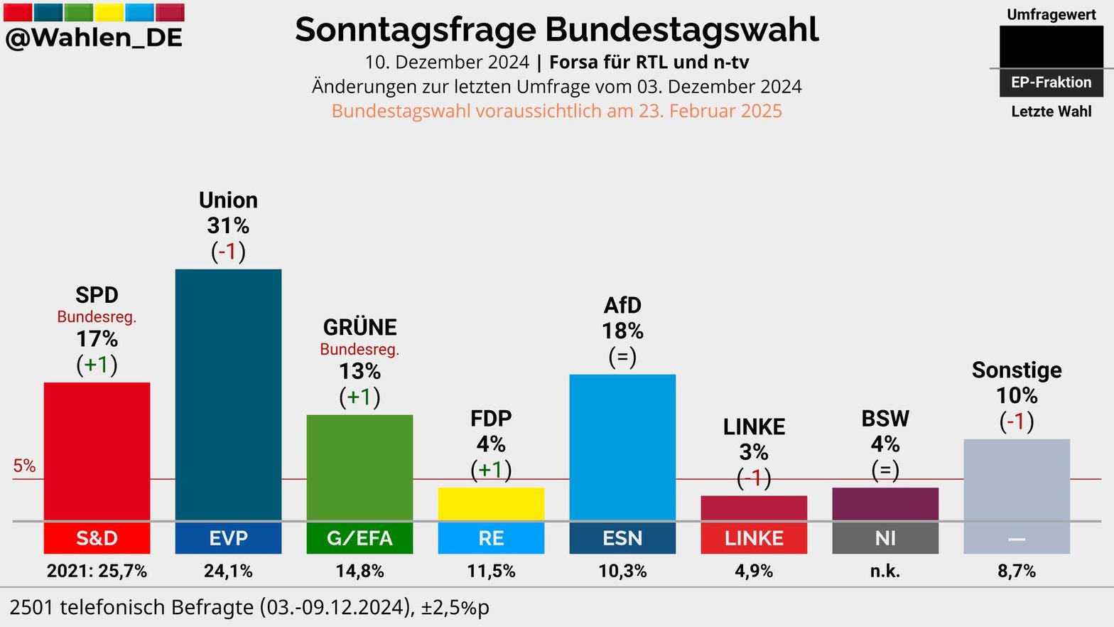 Ce dernier sondage montre que les chrétiens-démocrates conservent une avancée sensible sur les autres forces avec plus de 30% des intentions de vote. L’extrême-droite (AfD) arrive actuellement en deuxième position devant le SPD du chancelier Scholz et les Verts. Les libéraux du FDP associés jusqu’à récemment au pouvoir sont sur la corde raide et pourraient disparaitre du prochain parlement.
