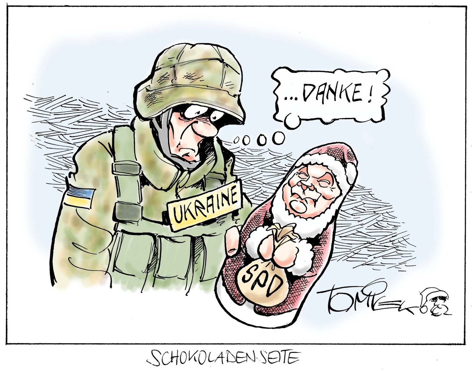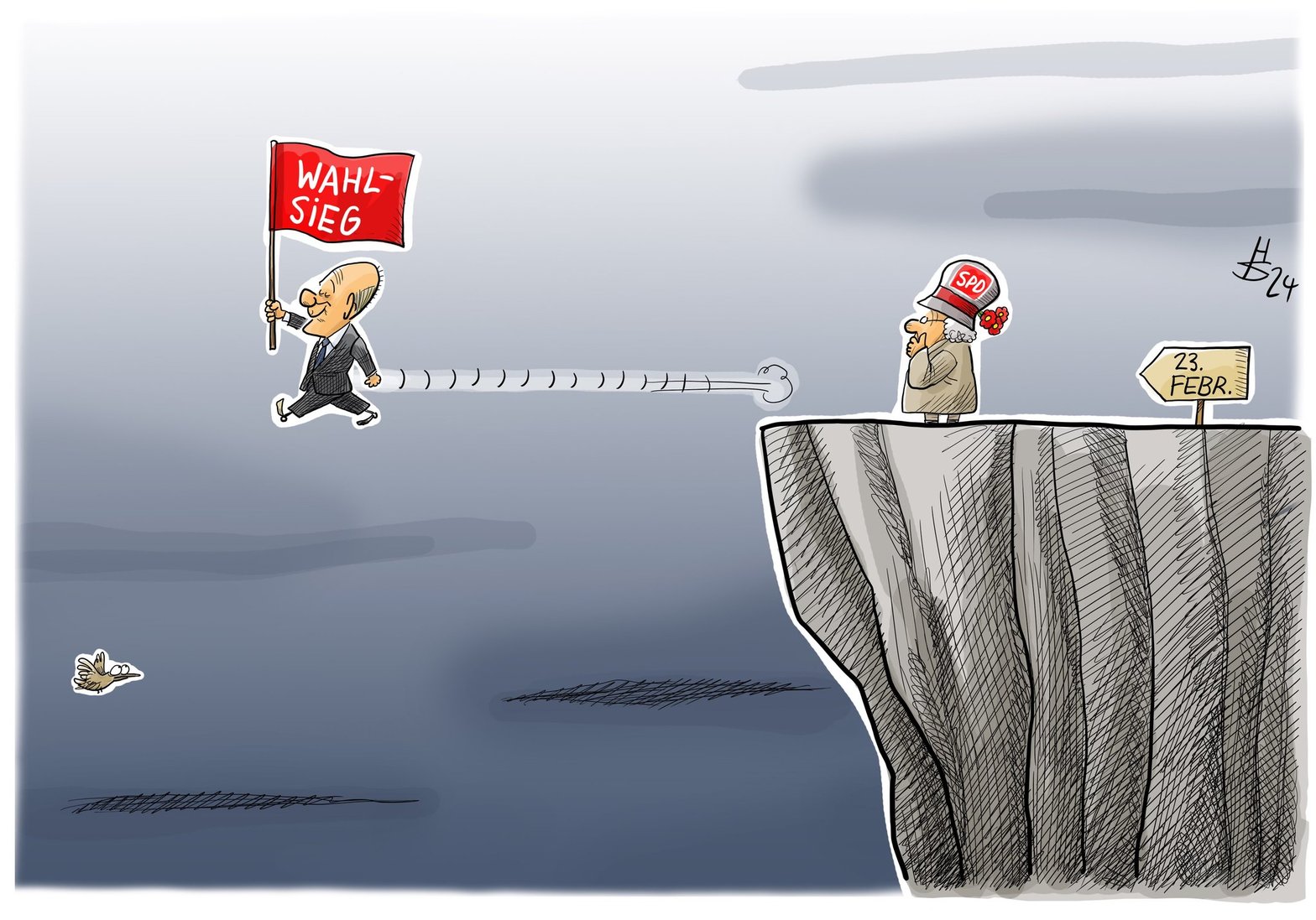 Ces sondages sont à prendre avec beaucoup de précaution en raison de la volatilité de l’électorat allemand. En 2005, Gerhard Schröder comme Olaf Scholz en 2021 ont effectué une remontée spectaculaire d’environ dix points dans la dernière ligne droite avant les législatives; l’avance des chrétiens-démocrates avait fondu comme neige au soleil. Aujourd’hui, Olaf Scholz pâtit d’une impopularité inédite qui rend un tel scénario moins crédible comme en témoigne cette caricature :