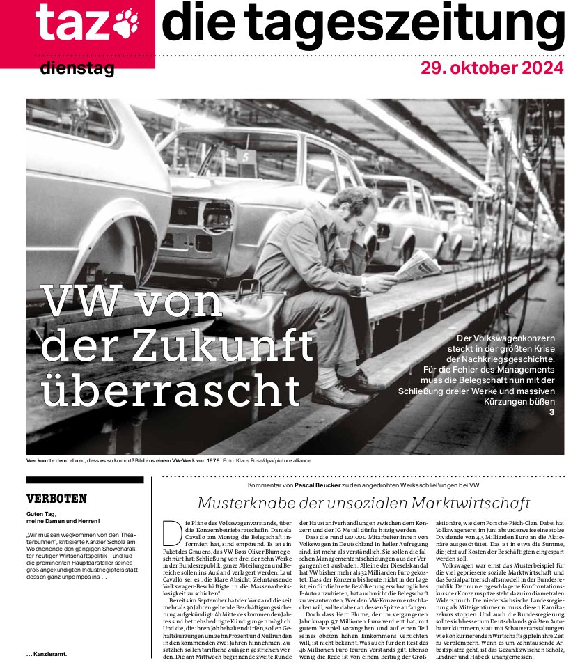 "Le crépuscule des dieux" : la une du quotidien "Tagesspiegel" ci-dessus résume bien le choc après l'annonce d'une possible restructuration brutale chez Volkswagen. La crise de ce symbole du modèle économique et social allemand est emblématique de la situation du pays en général.