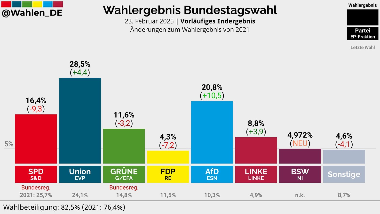 Avec 16,4% des voix, les sociaux-démocrates enregistrent un résultat dramatique. Même en mars 1933 alors que Hitler était déjà au pouvoir et que des élections libres n’étaient plus vraiment garanties, le SPD avait obtenu un score supérieur. Le désaveu massif subi par le chancelier sortant Olaf Scholz se traduit dans les urnes. Son espoir d’une remontada dans la dernière ligne droite comme en 2021 ne s’est pas traduit dans les urnes. Le SPD perd 3,7 millions d’électeurs par rapport à septembre 2021 et plus de 9% des voix !