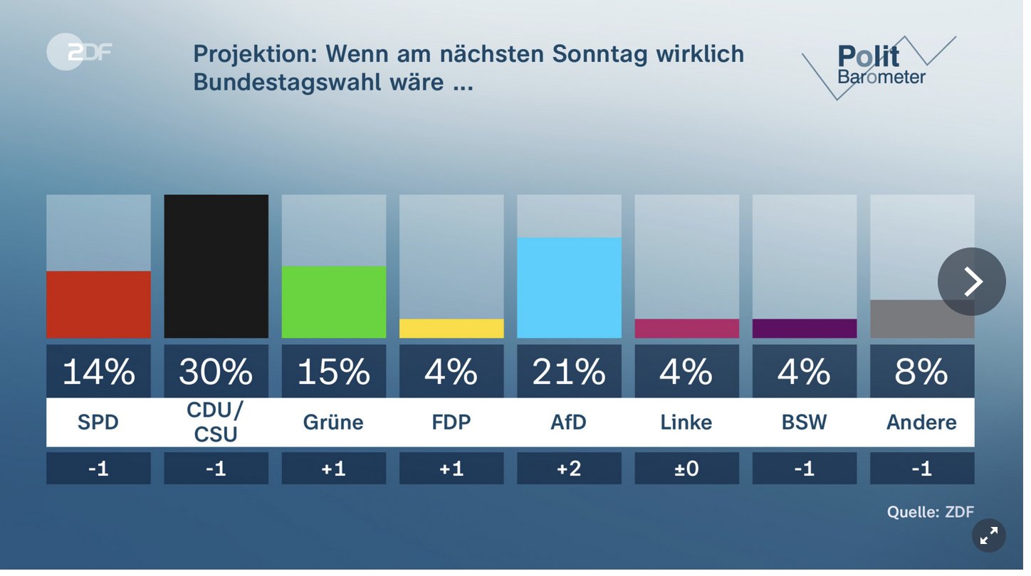 Les chrétiens-démocrates conservent une avance sensible dans les sondages mais restent nerveux. Les derniers sondages indiquent une légère décrue. Dans l’un d’eux, ils passent sous la barre symbolique des 30%. Un coup politique de Scholz (voir ci-dessus) n’est pas à exclure. Et le caractère impulsif du candidat à la chancellerie Friedrich Merz peut à tout moment causer un dommage collatéral négatif pour les ambitions électorales du parti.