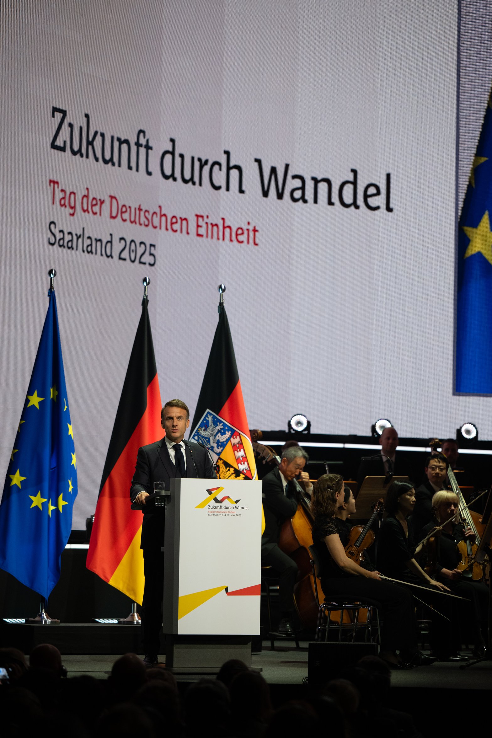 Le président de la république Frank-Walter Steinmeier, le chancelier Friedrich Merz et de nombreux autres personnalités étaient à Sarrebruck vendredi. La ministre-présidente de la Sarre, la sociale-démocrate Anke Rehlinger, par ailleurs plénipotentiaire pour les relations culturelles franco-allemandes, avait profité de sa participation au conseil des ministres franco-allemand à Toulon fin août pour inviter Emmanuel Macron. C’était la première fois depuis l’an 2000 avec Jacques Chirac lors du dixième anniversaire de la réunification qu’un président français assistait à cette cérémonie.