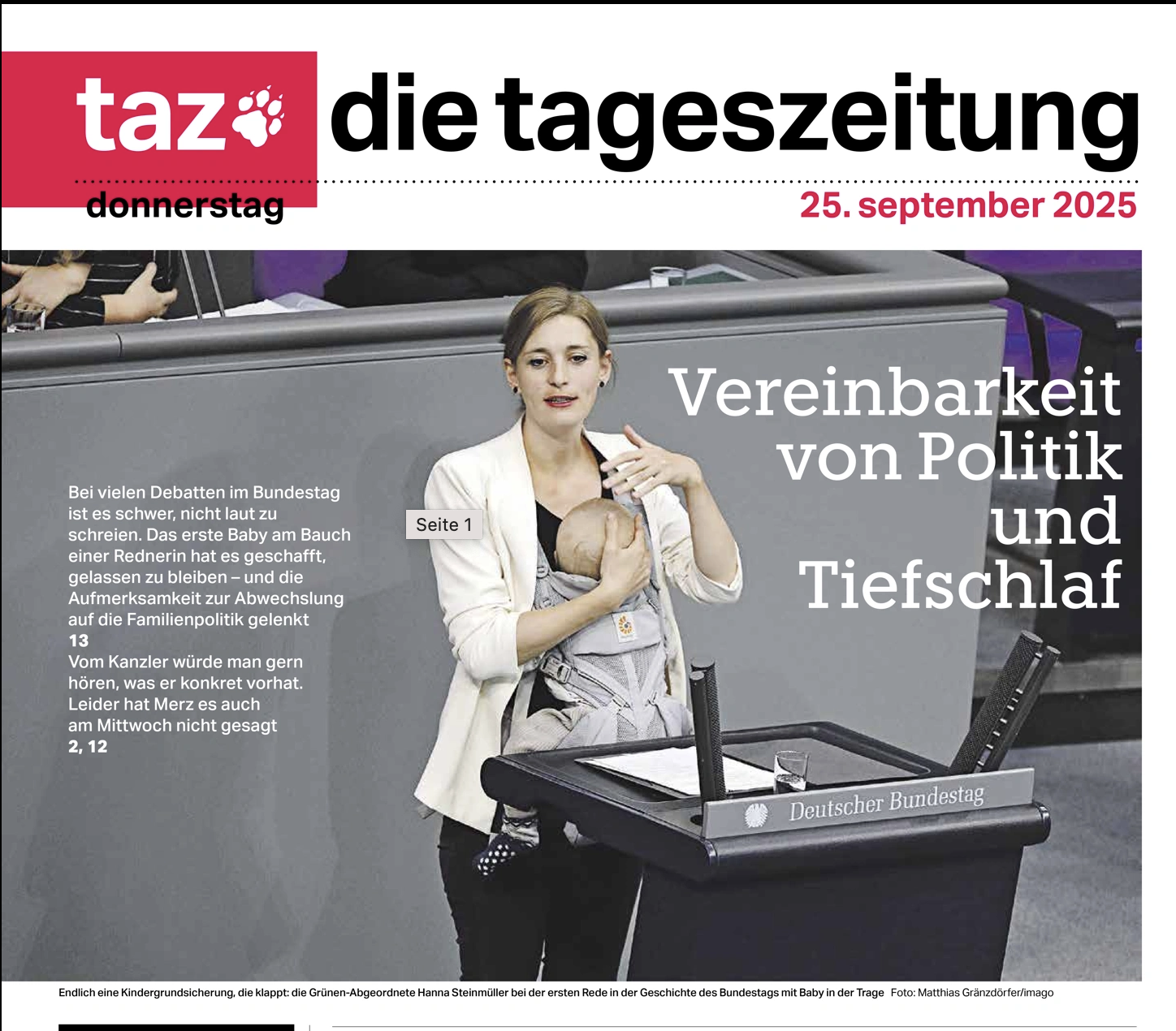 Une première au parlement allemand a eu lieu fin septembre. La députée écologiste Hanna Steinmüller qui devait prendre la parole lors des débats n’a pas confié son bébé à une autre personne le temps de son discours mais s’est dirigée avec ce dernier sur la poitrine vers la tribune du Bundestag. Elle affirme ne pas avoir prévu cette première. Déranger son enfant qui dormait l’aurait sans doute réveillé.