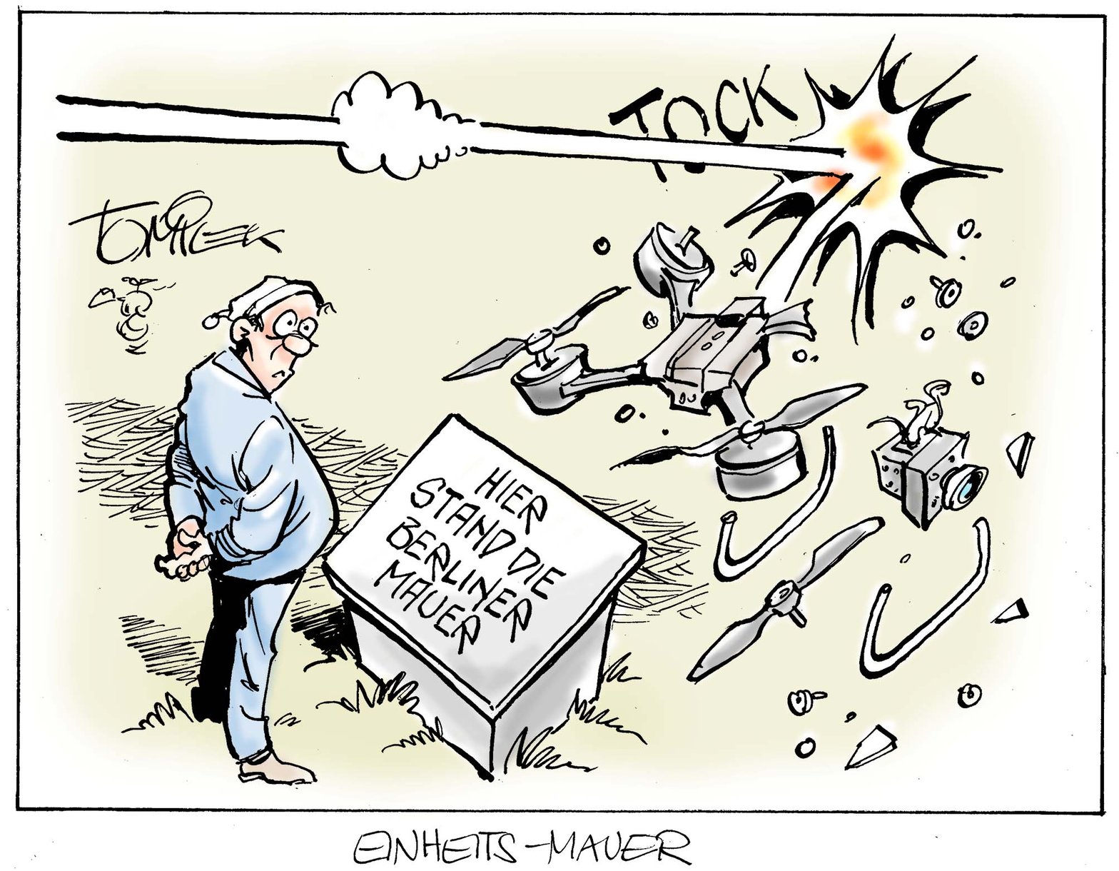 Un drone s’écrase contre le mur invisible entre les deux Allemagnes. Sur le panneau, on peut lire “C’est ici que se dressait le mur de Berlin”