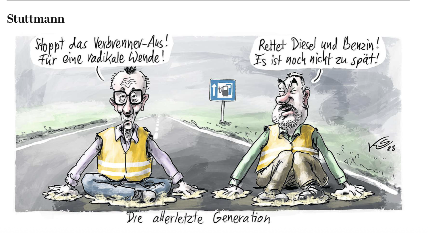 Verra-t’on bientôt comme dans la caricature ci-dessous le chancelier Merz (à gauche) et le patron de la CSU bavaroise Markus Söder recourir à de telles actions spectaculaires pour protester contre la fin des moteurs thermiques en 2035 et réclamer un sursis supplémentaire pour ces véhicules ? On peut en douter. Mais la petite musique qui montait au sein de l’industrie automobile allemande au profit d’un assouplissement obtient de plus en plus le soutien des chrétiens-démocrates que les réductions d’emplois évoquées ci-dessus alertent. La décarbonation de l’économie pourrait-elle renforcer la désindustrialisation de l’Allemagne ? Friedrich Merz a récemment fait une sortie en faveur d’une plus grande flexibilité dans l’application des délais pour la fin des moteurs thermiques au sein de l’Union européenne.