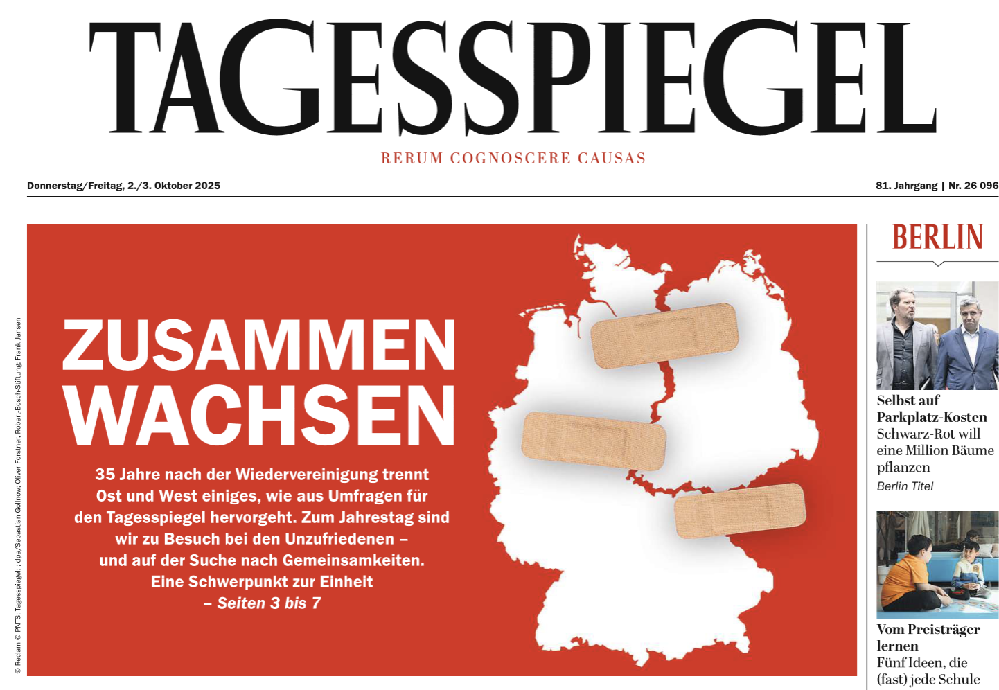 ”Grandir ensemble” : la une du quotidien avec des morceaux de pansements pour rapprocher les deux parties de l’Allemagne
